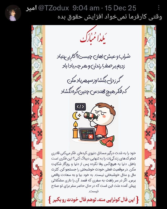 ‏بنده در شادترين جمع چون ادم مورد علاقم ٢ دقيقه ديرتر و يكم سردتر از هميشه جواب پياممو داده: