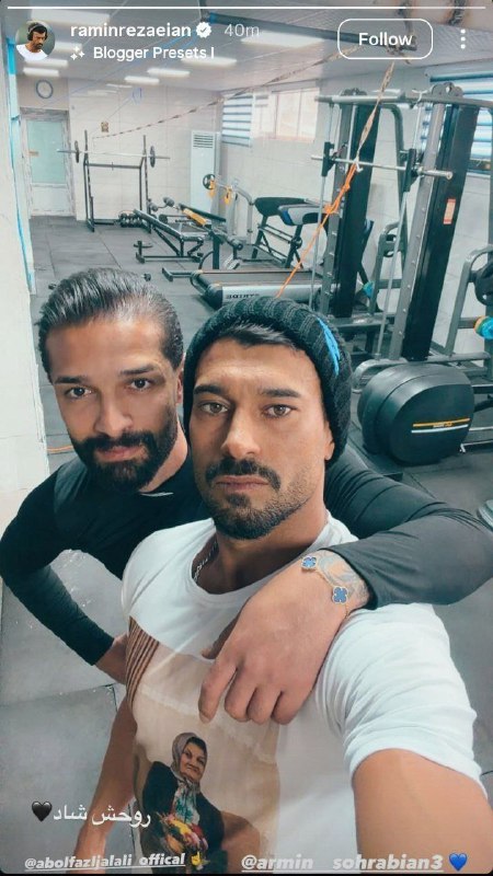 رامین رضاییان عکس مادربزرگ ابوالفضل جلالی رو روی تیشترش چاپ کرده استوری گذاشته بهش تسلیت گفته.