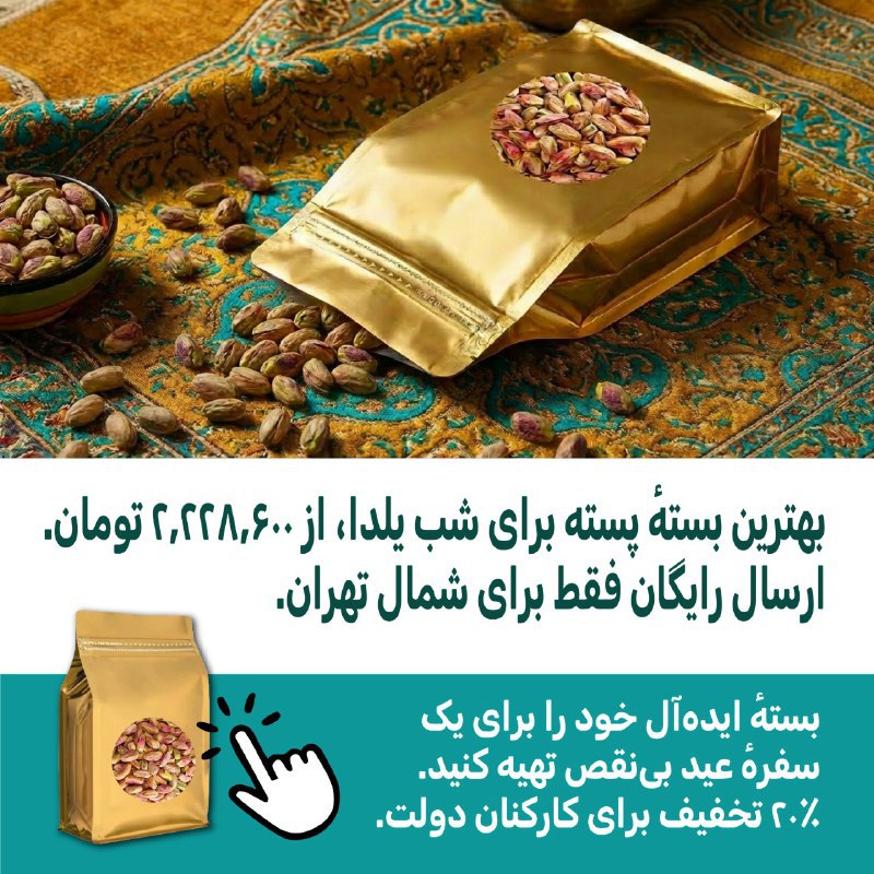 📣 فرصت ویژه خرید پسته شب یلدا! دنبال یه هدیه یا پذیرایی خاص میگردی؟ بسته پسته طلایی ما با بهترین کیفیت آماده ارسال است. کارمند دولتی؟ ۲۰٪ از ما تخفیف بگیر! ساکن شمال تهرانی؟ هزینه ارسال با ما! بزن روی لینک و سفارشت رو نهایی کن!
