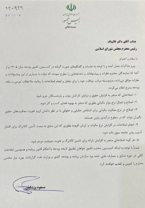 🔺نامه پزشکیان به مجلس درباره اصلاحات پنج‌گانه در بودجه