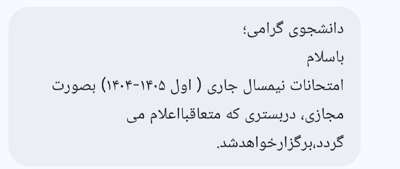 پیام ارسالی دانشگاه آزاد اسلامی به دانشجویان برای برگزاری مجازی امتحانات نیمسال ۱۴۰۵_۱۴۰۴