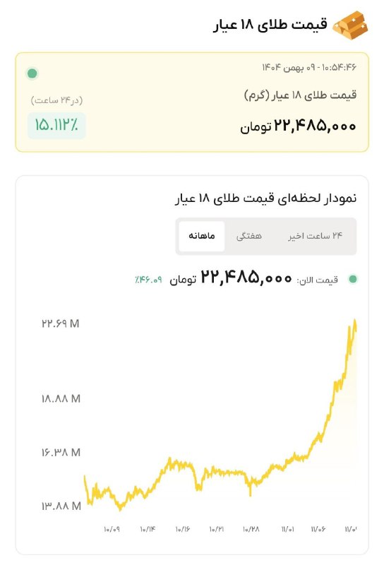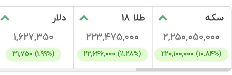 🔹قیمت طلای ۱۸ عیار در بازار امروز تهران به ۲۲ میلیون و ۲۷۵ هزار و ۹۰۰ تومان و قیمت سکه امامی به ۲۲۵ میلیون و ۱۰ هزار تومان رسید.