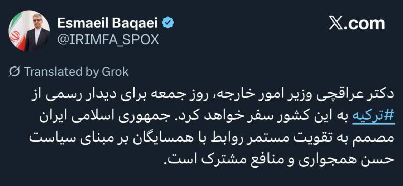 🔴سخنگوی وزارت امور خارجه: عراقچی روز جمعه برای دیدار رسمی به ترکیه سفر خواهد کرد