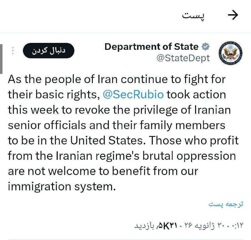 🔴وزارت امورخارجه آمریکا: فرزندان و اعضای خانواده مقامات ایرانی را از آمریکا اخراج خواهیم کرد.