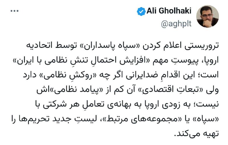 🔹تروریستی اعلام کردن «سپاه پاسداران» توسط اتحادیه اروپا، پیوستِ مهم «افزایش احتمالِ تنشِ نظامی با ایران» است