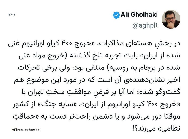 ✍️علی قلهکی، فعال رسانه‌ای اصولگرا، تلویحا از احتمال موافقت سخت تهران با پیشنهاد ترامپ مبنی بر خروج ۴۰۰ کیلو اورانیوم غنی شده از کشور خبر داد