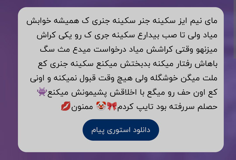 ن من جسارت نکردم ک شما عقده ای هستی دور از جونت یا سر سفره پدر مادرت بزرگ نشدی😐💔 عجبا ن من تو رابطه ای نمیرم کلا رو خودم دارم کار میکنم 😕