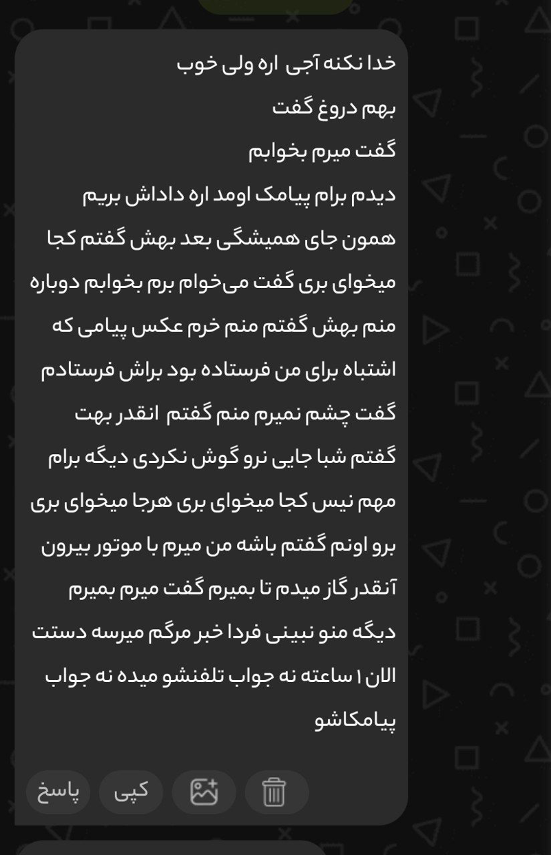 ن من جسارت نکردم ک شما عقده ای هستی دور از جونت یا سر سفره پدر مادرت بزرگ نشدی😐💔 عجبا ن من تو رابطه ای نمیرم کلا رو خودم دارم کار میکنم 😕