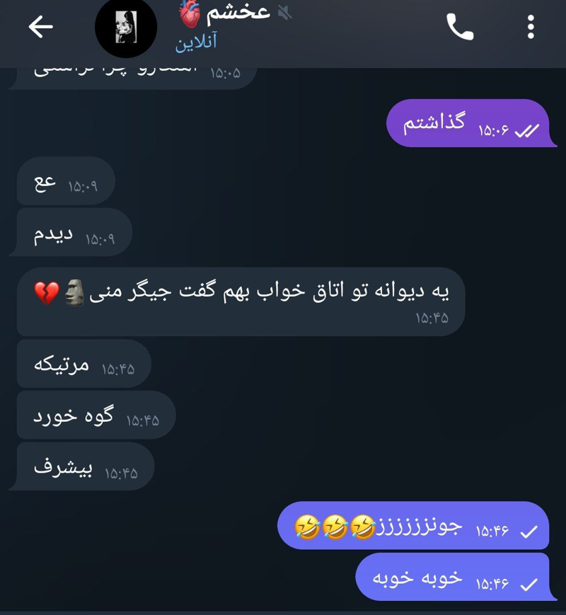 خب وقتی محدودی چجوری میخوای بری به مدیر چنل بگی😂😔ایدیتو بده من بهش میدم میگم بهت پیم بده 😂