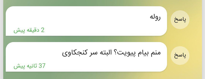 1 ناشناسسسس 2 نت وصل نیست و بدردت نمیخوره ، وصل شد میزارم چنل 3 جدی راستمیگی؟ مرسی🎀