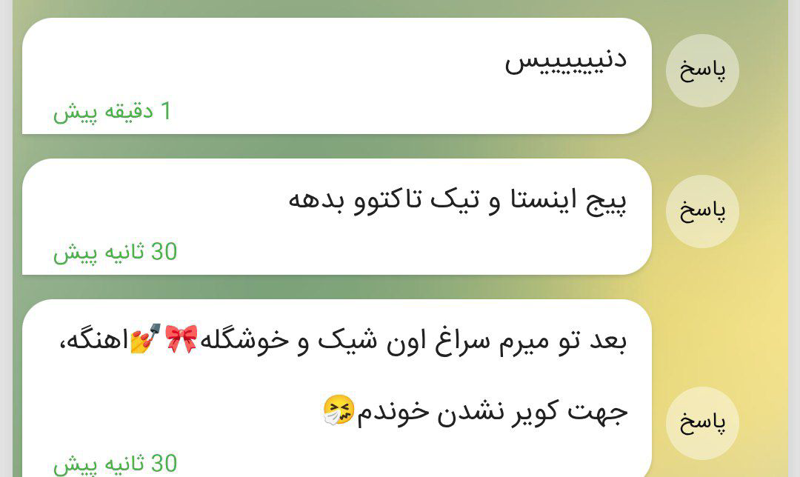 1 ناشناسسسس 2 نت وصل نیست و بدردت نمیخوره ، وصل شد میزارم چنل 3 جدی راستمیگی؟ مرسی🎀