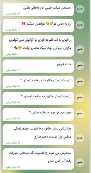 1 شاید 2 🎀 3 چوم 4 چرا اخههه 5 عادت کردم 6 نه نراحت نیستم😂 7 چ ربطی داره؟ اگه کسی با رنگ کردن مو و پیرسینگ زدن فنبوی حساب میشه الان نصف کره زمین همینی بودن ک تو میگی 8 داش بازرسی؟ 9 عیبابا