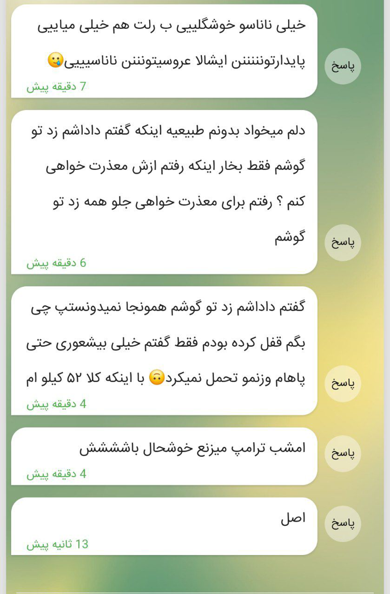 ۱ سلام باش @romania ۲عکسشو بده پیویم ببینم کیو میگی زبون بسته😂😂 ۳ میدم الان ۴ اره دوتا خواهر دارم یکی ۲۹ سالشه اسمش عفیفه اس یکی دیگ دارم ۱۲ سالشه اسمش عادله اس اسم سه تاییمون کنار هم میشه عفیفه عارفه عادله 🥲 ۵ این بستگی به شانس داره ولی خوب با