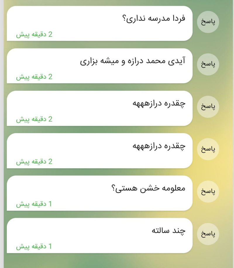 ۱ چه چیزایی میپرسین احمقین به خدا به تو چه اصن ایش ۲ هر گوهی هستی گفتم بیا پیوی بگو کیه آیدی بدم عجبا کصخلی ۳ بوص بوص ۴ روانشاسی