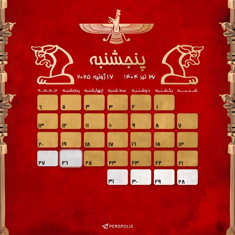 امروز پنجشنبه ۲۶ تیر ۱۴۰۴ خورشیدی ۱۷ ژوئیه ۲۰۲۵ میلادی