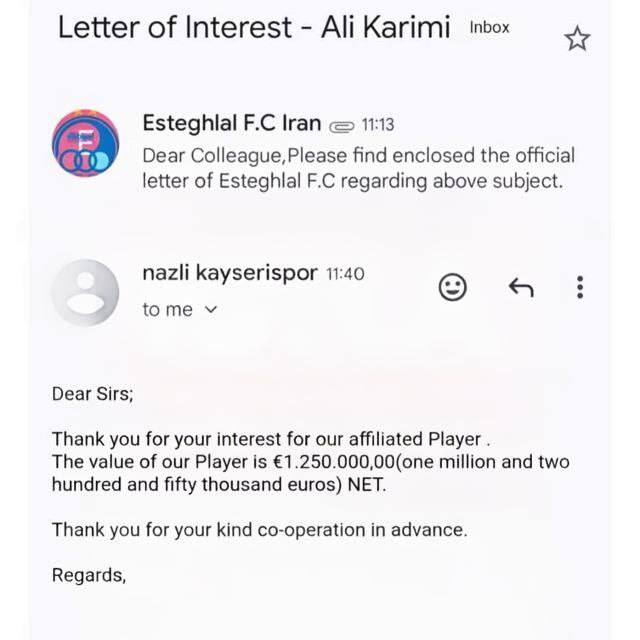 ایمیل کایسری‌اسپور که از استقلال درخواست ١/٢ میلیون‌یورو رضایتنامه کریمی رو کرده یعنی حدود ١٢۵ میلیارد