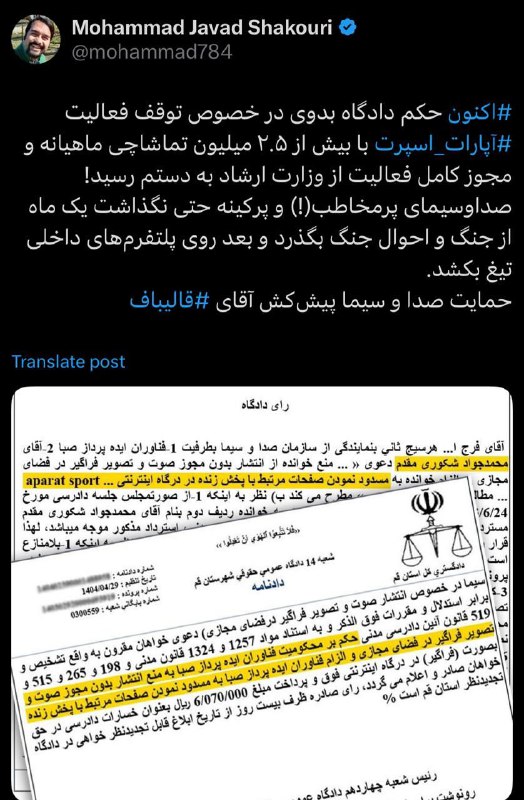 ‼️⚠️صداوسیما مجوز توقیف آپارات اسپورت را بدلیل اینکه عادل فردوسی‌پور گزارشگر بازی‌های فوتبال بود، گرفت!