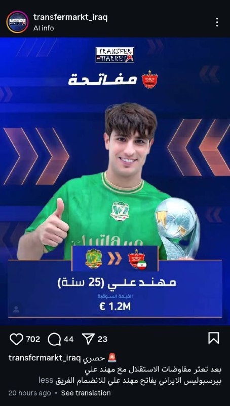 ✅کپشن: پس از شکست مذاکره استقلال با مهند علی پرسپولیس درحال مذاکره با مهند علی برای پیوستن به این تیم است.