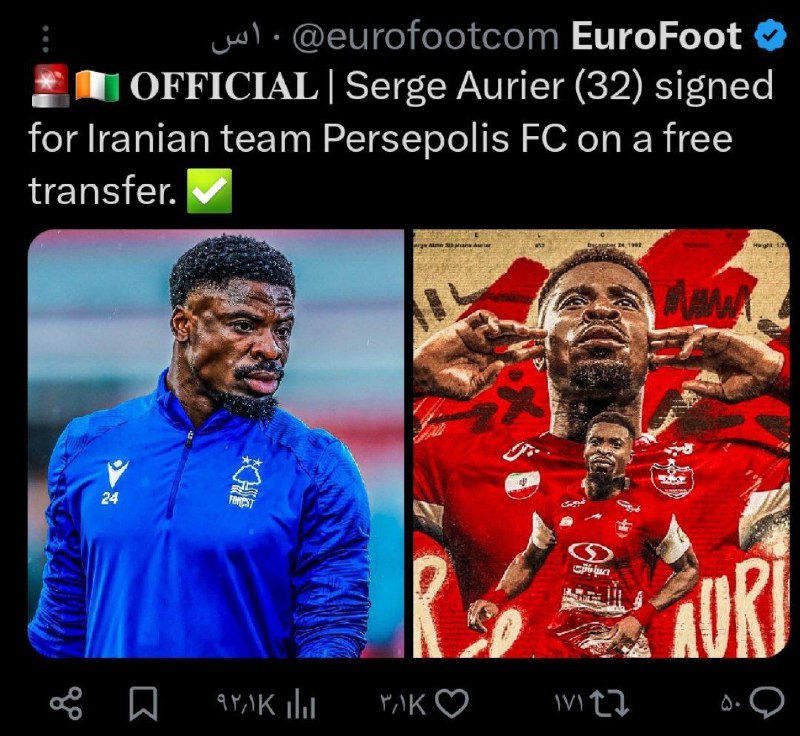 بازتاب خبر پیوستن سرژ اوریه، بازیکن سابق پاریسنژرمن و تاتنهام به پرسپولیس در رسانههای خارجی