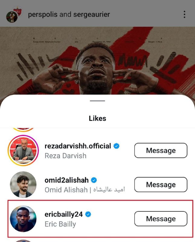 🔴اریک بایی که صحبت حضور او در پرسپولیس مطرح هست، پست مربوط به انتقال سرژ اوریه به پرسپولیس را لایک کرد.