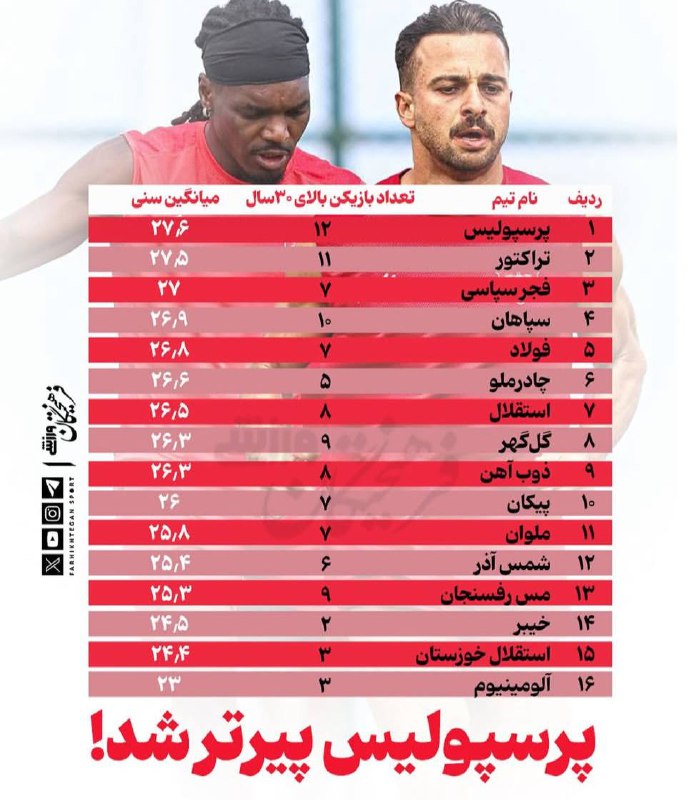 ‼️ پرسپولیس با 12 بازیکن بالای 30 سال پیرترین تیم لیگ ایران شد!