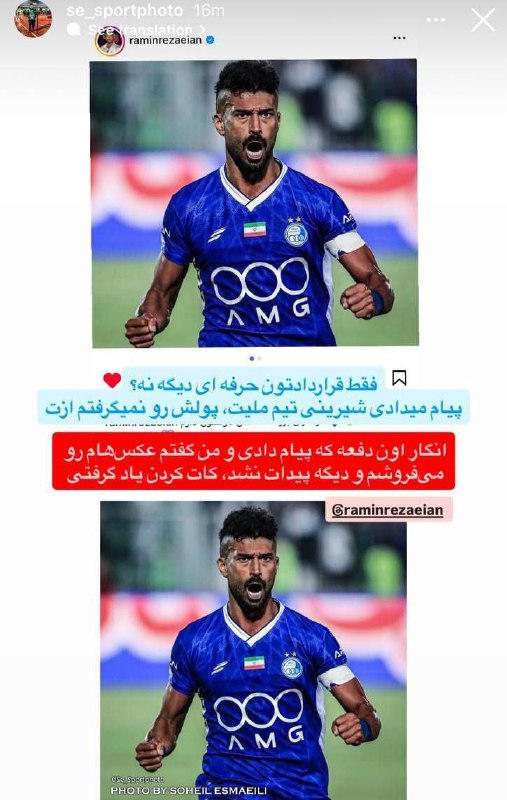 ‼️⚽️استوری سهیل اسماعیلی عکاس رسانه خبرورزشی علیه بیاخلاقی رامین رضاییان!