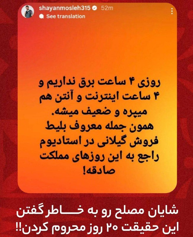 😱 شایان مصلح به دلیل استوری اعتراضی نسبت به قطعی برق 20 روز محروم شد!