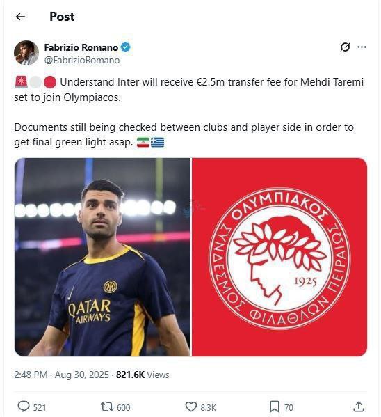 مهدی طارمی، با مجوز سرمربی تیم ملی، روز یکشنبه(امروز) برای انجام تست‌های پزشکی و امضای قرارداد رسمی به یونان سفر می‌کند. او پس از عقد قرارداد، با پرواز اختصاصی باشگاه المپیاکوس به اردوی تیم