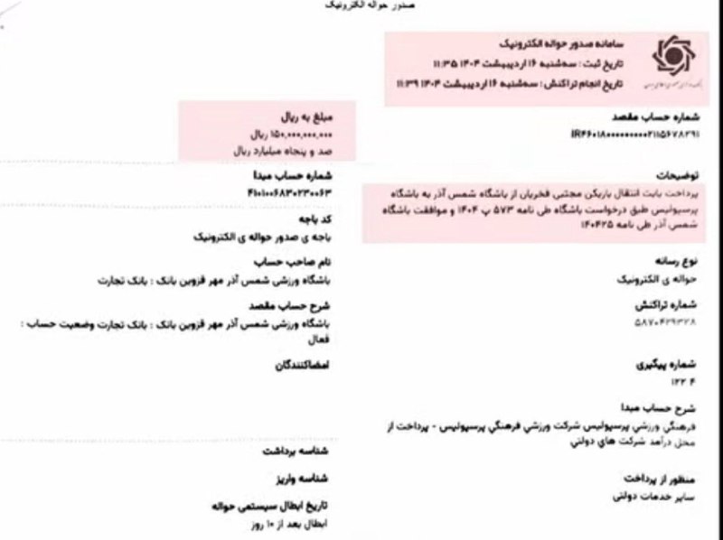 باشگاه پرسپولیس فیش واریزی به حساب باشگاه شمس آذر برای پرداخت رضایت نامه فخریان را رونمایی کرد.