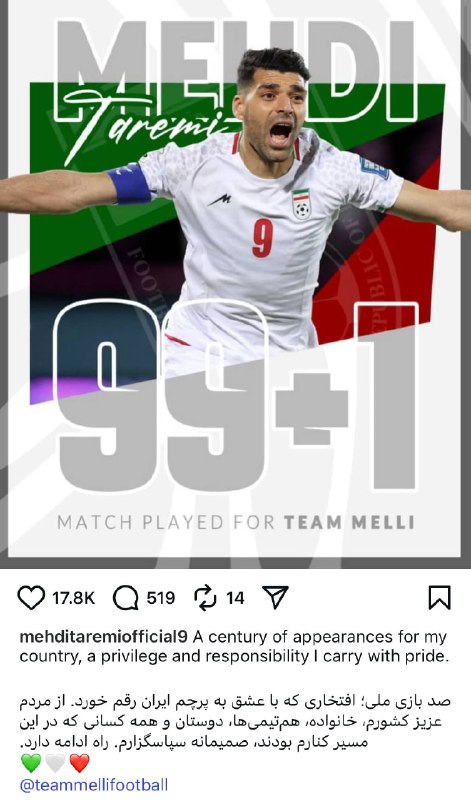 پست اینستاگرامی مهدی طارمی پس از صدمین بازی ملی