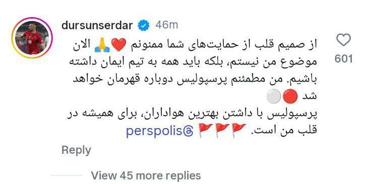 عالیشاه، کاپیتان پرسپولیس، در پایان تساوی ناامیدکننده تیمش مقابل ملوان، آخرین بازیکنی بود که زمین را ترک کرد. او در میانه زمین با حرکاتی کوتاه تلاش کرد از هواداران بابت نمایش ضعیف سرخها عذرخواهی کند و سپس با سری پایین و بدون گفتوگو با خبرنگاران، اس