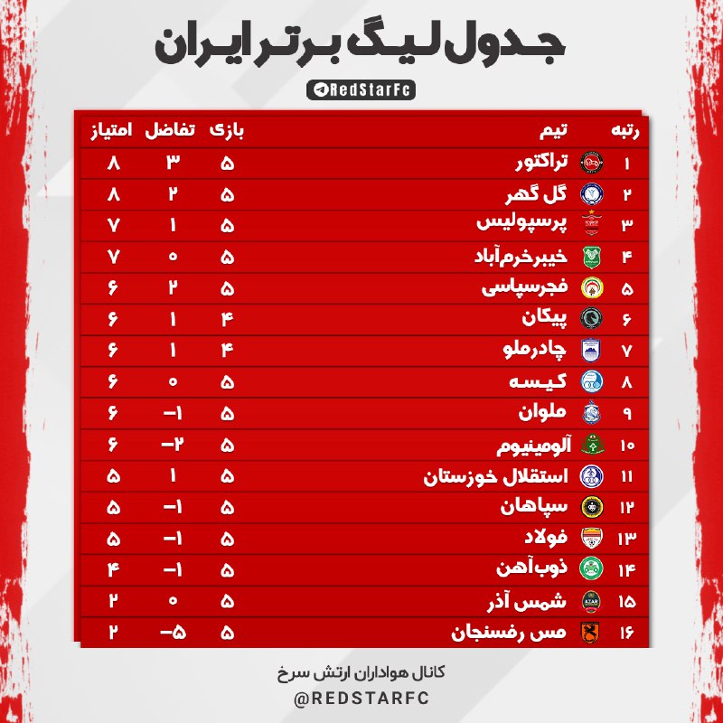 جدول لیگ برتر در پایان دیدارهای هفته پنجم