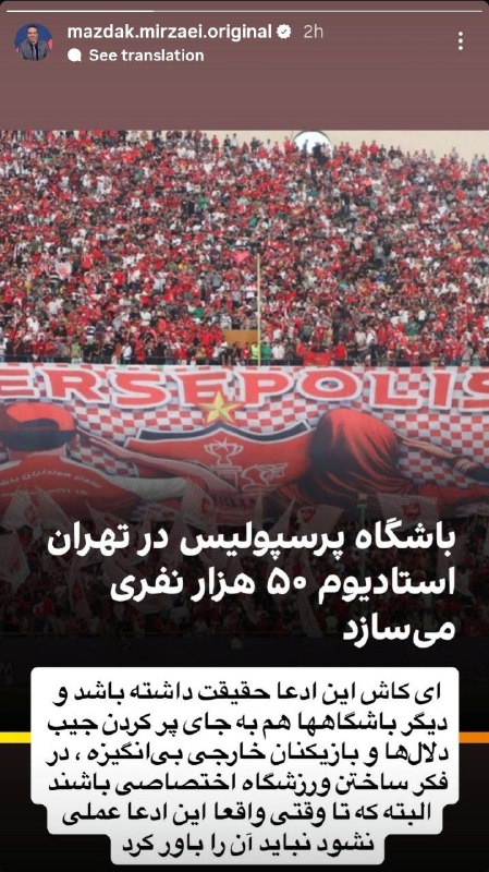 واکنش مزدک میرزایی به ساخت ورزشگاه اختصاصی پرسپولیس