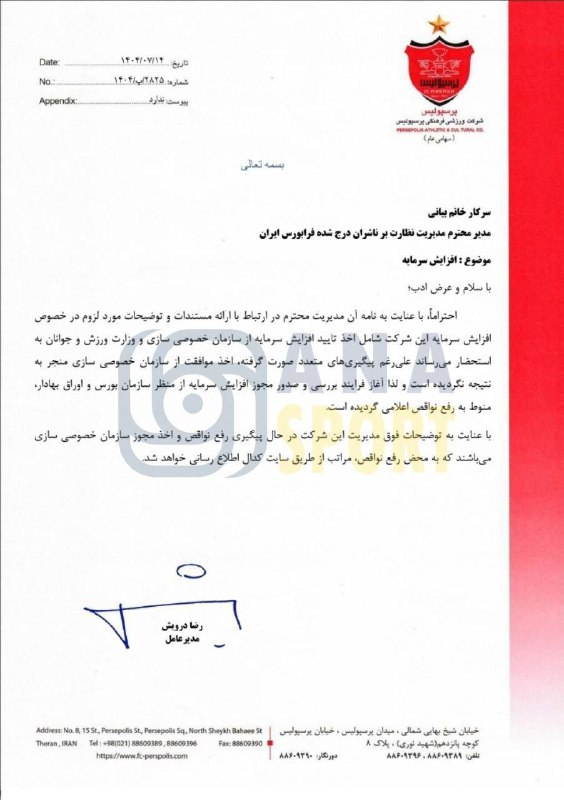 باشگاه پرسپولیس با ارسال نامهای و انتشار آن در سایت کدال، خبر از نهایی نشدن موضوع افزایش سرمایه این باشگاه شد.