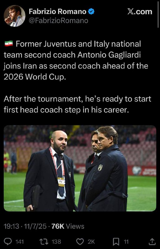 فوری از رومانو: آنتونیو گالیاردی، دستیار سابق تیم ملی ایتالیا و باشگاه یوونتوس، به عنوان دستیار دوم تیم ملی ایران پیش از جام جهانی ۲۰۲۶ منصوب شد.
