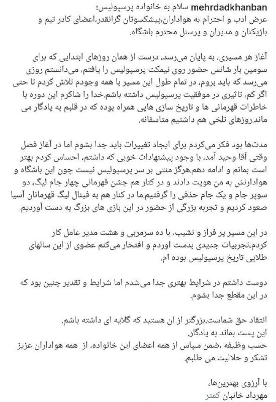 پست خداحافظی مهرداد خانبان از پرسپولیس: دوست داشتم در شرایط بهتری جدا می‌شدم اما شرایط و تقدیر چنین بود انتقاد حق شماست بزرگتر از آن هستید که گلایه‌ای داشته باشم