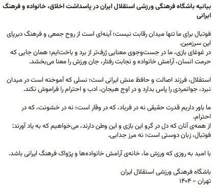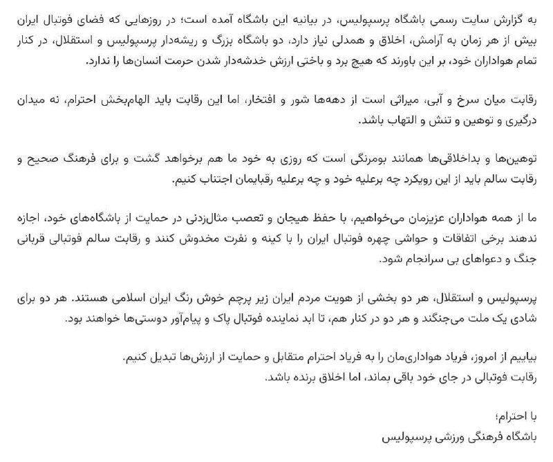 بیانیه جدید باشگاه پرسپولیس در واکنش به اتفاقات اخیر: پرسپولیس و استقلال بخشی از هویت مردم ایران‌ زیر پرچم خوش رنگ ایران اسلامی هستند. هر دو برای شادی یک ملت می‌جنگند و در کنار هم تا ابد نماینده‌ فوتبال پاک و پیام‌آور دوستی‌ها خواهند بود.