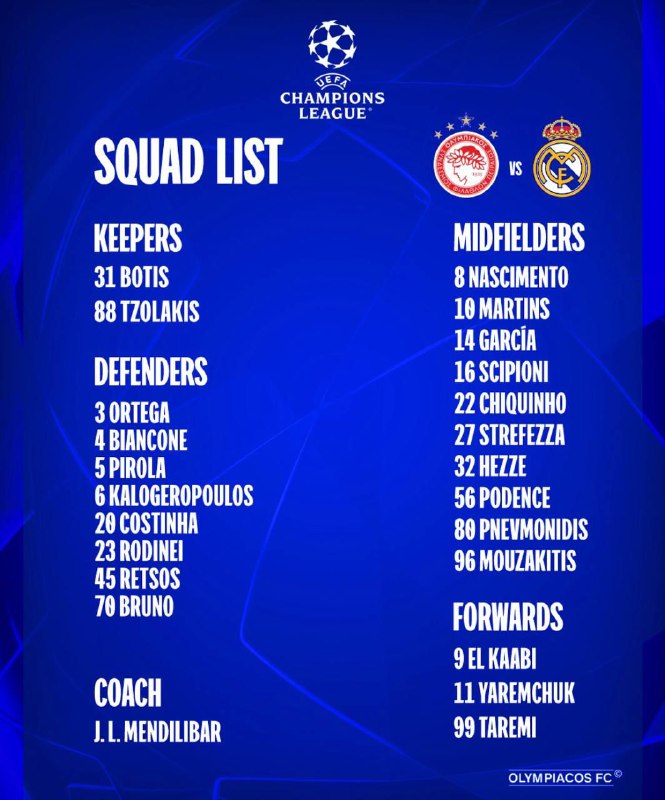 لیست المپیاکوس برای دیدار با رئال مادرید با حضور مهدی طارمی