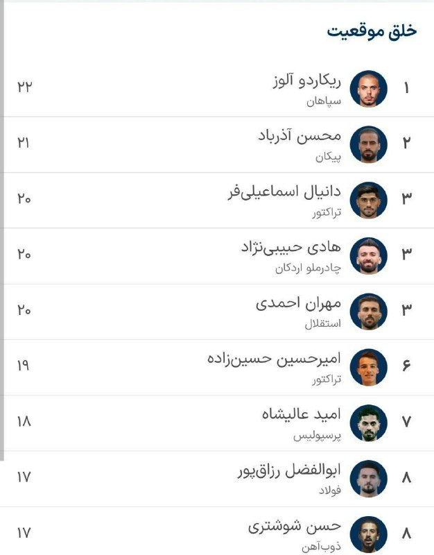 بهترین بازیکنان لیگ برتر از لحاظ خلق موقعیت؛ حضور امید عالیشاه در رده هفتم