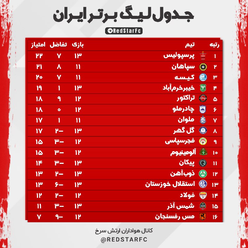 جدول لیگ برتر در پایان دیدارهای هفته سیزدهم