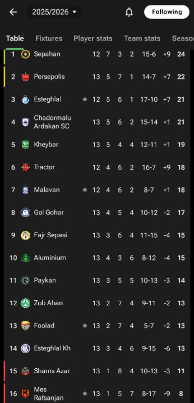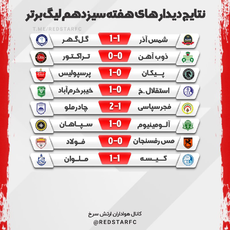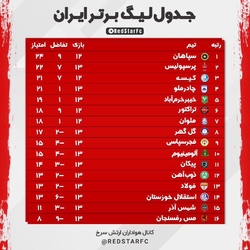 جدول لیگ برتر در پایان دیدارهای هفته سیزدهم