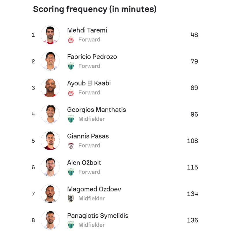 عملکرد مهدی طارمی در لیگ یونان: با 48 دقیقه، ستاره ایرانی بهترین میانگین زمان گل‌زنی (به دقیقه) را در بین تمامی بازیکنان و ستارگان این فصل لیگ یونان به ثبت رسانده است