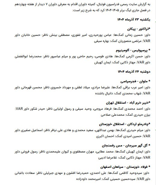 🚨اعلام اسامی داوران 7 دیدار از هفته چهاردهم لیگ برتر؛ حسن اکرمی داور بازی پرسپولیس شد