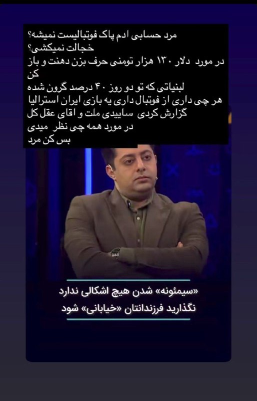 خیابانی تو برنامه دیشب لذت فوتبال یه حرف جنجالی زده و گفته:«بذارید یه نگاه جامع‌شناسانه کنم؛ آدمی که عادت به رفتارای اجتماعی داشته باشه، به‌عنوان یه آدم پاک، فوتبالیست نمی‌شه. تو