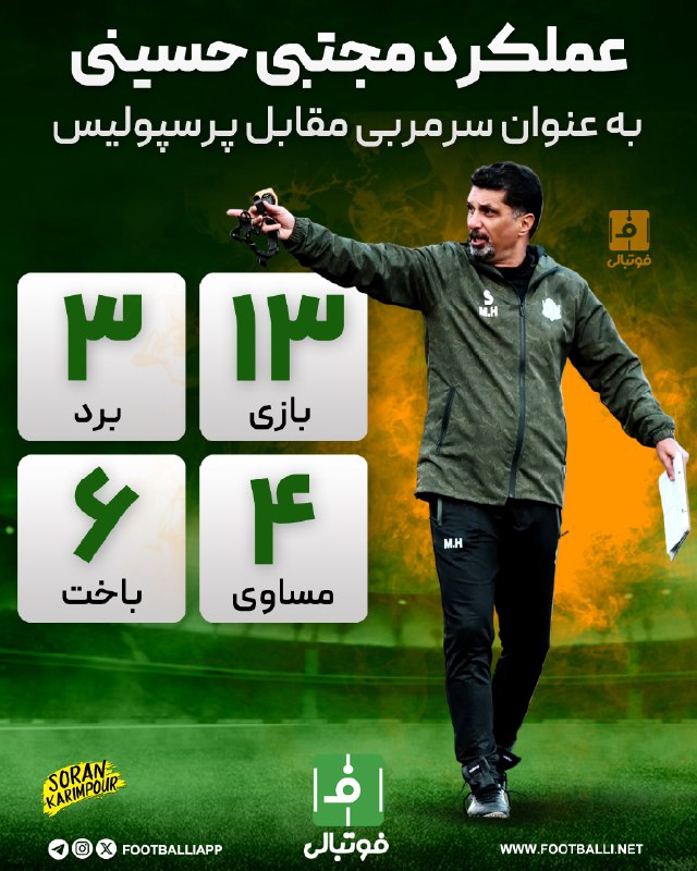 📊عملکرد مجتبی حسینی به عنوان سرمربی مقابل پرسپولیس
