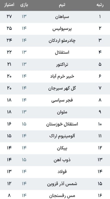 جدول لیگ‌برتر پس از بازی‌های امروز