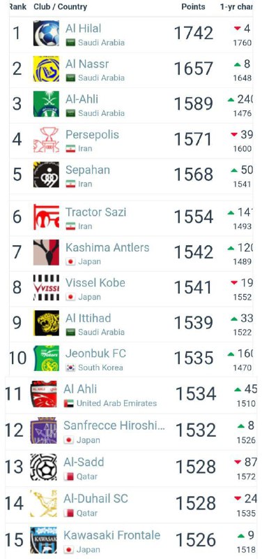⭕بهترین تیم‌های فعلی باشگاهی فوتبال آسیا با حضور تیم پرسپولیس در‌ رده چهارم