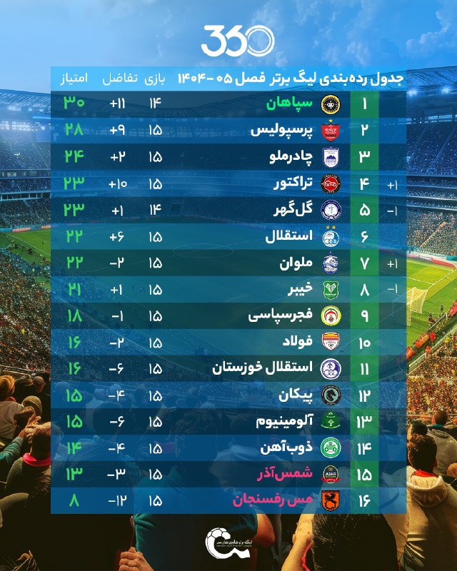 جدول لیگ‌برتر ایران پس از تساوی تراکتور