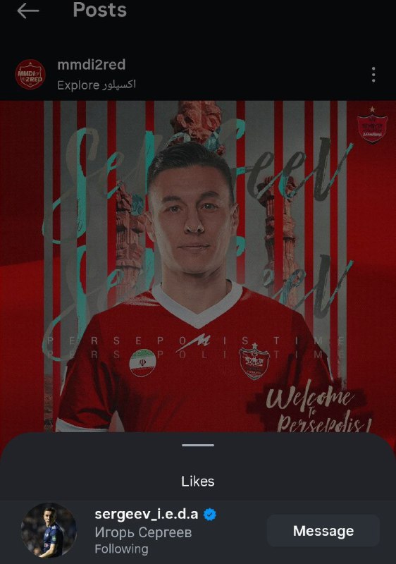 🚨ایگور سرگیف پست مربوط به پیوستنش به پرسپولیس را لایک کرد