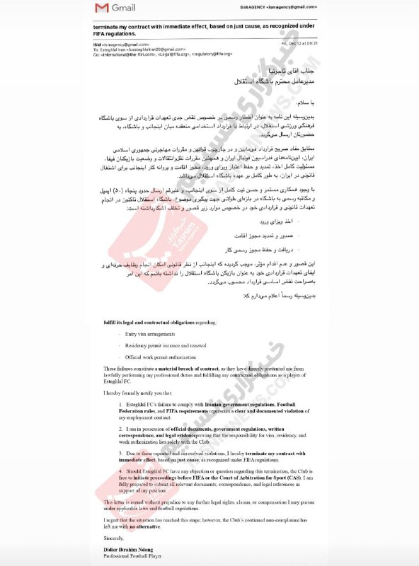 🚨نامه فسخ قرارداد دیدیه‌اندونگ با کیسه